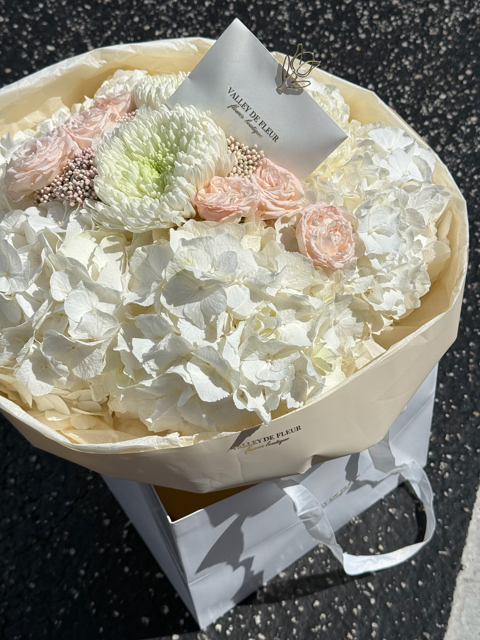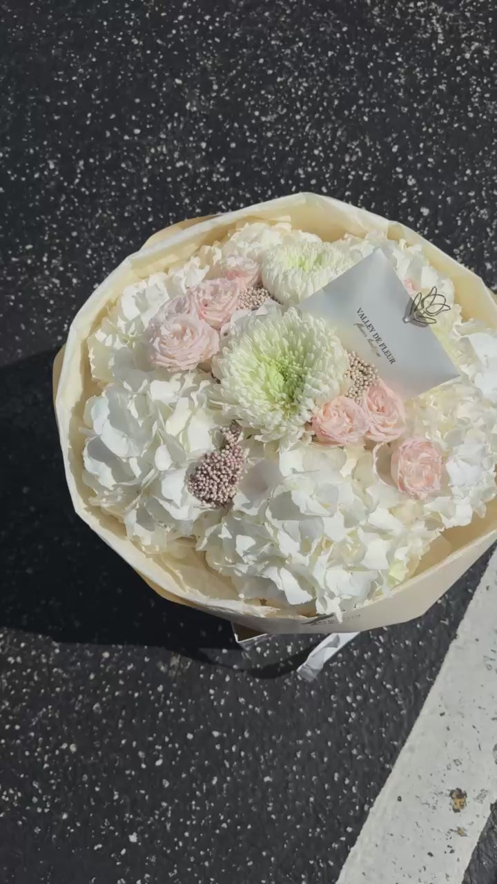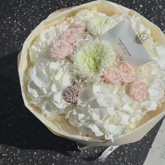 Elevate any occasion with this sophisticated floral arrangement featuring pristine white hydrangeas as the focal point, complemented by delicate spray blush roses and crisp white chrysanthemums. The combination of varied textures and soft tones creates an elegant, timeless composition perfect for weddings, anniversaries, or refined home décor. Each bloom is carefully selected to ensure longevity and visual impact, making this arrangement an ideal choice for those seeking understated luxury and botanical excellence.