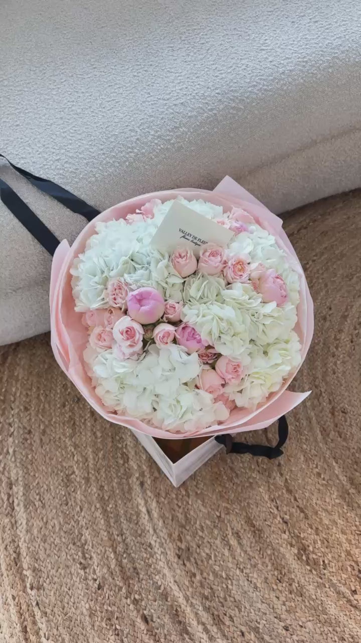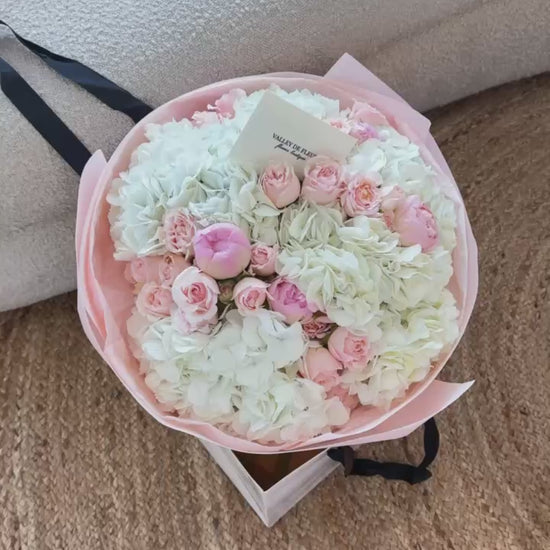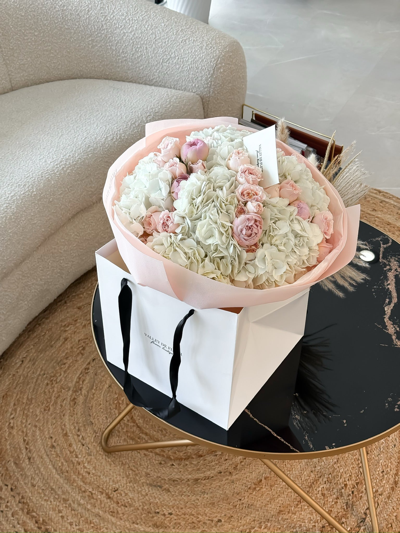 Celebrate timeless elegance with this sophisticated floral arrangement featuring pristine white hydrangeas paired with delicate blush spray roses. The hydrangeas provide lush, voluminous blooms that serve as a stunning foundation, while the spray roses add romantic dimension and refined detail. This combination creates a graceful composition perfect for weddings, anniversaries, or any occasion calling for understated luxury. The soft color palette evokes purity and tenderness, making it an ideal choice for expressing heartfelt sentiments with understated sophistication.