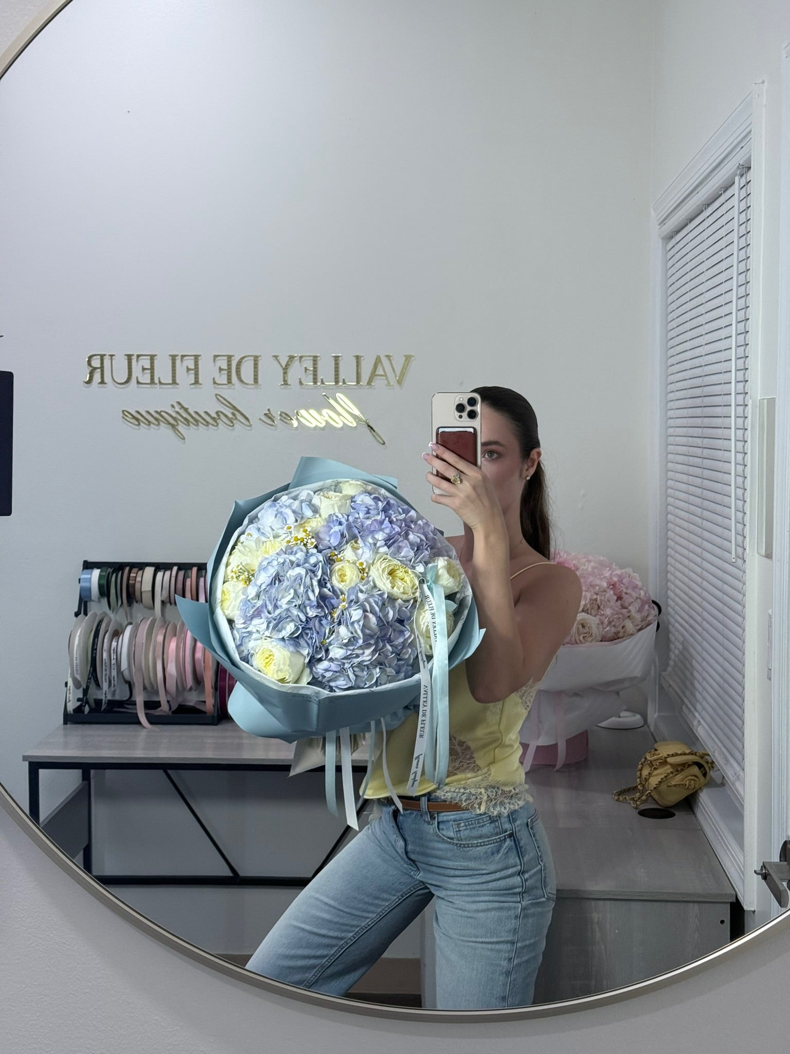 Introducing Blue Symphony, an expertly curated arrangement that celebrates the timeless pairing of delicate blooms. This petite bouquet features premium blue hydrangea, prized for its full, voluminous clusters and sophisticated hue, complemented by pristine white roses that add classic elegance and refined beauty. Perfect for intimate gifting occasions, this arrangement brings understated luxury to any space. Each stem is hand-selected and arranged with meticulous attention to detail, ensuring a composition that speaks to both aesthetic refinement and emotional resonance. An ideal choice for those who appreciate quality floristry and subtle sophistication.