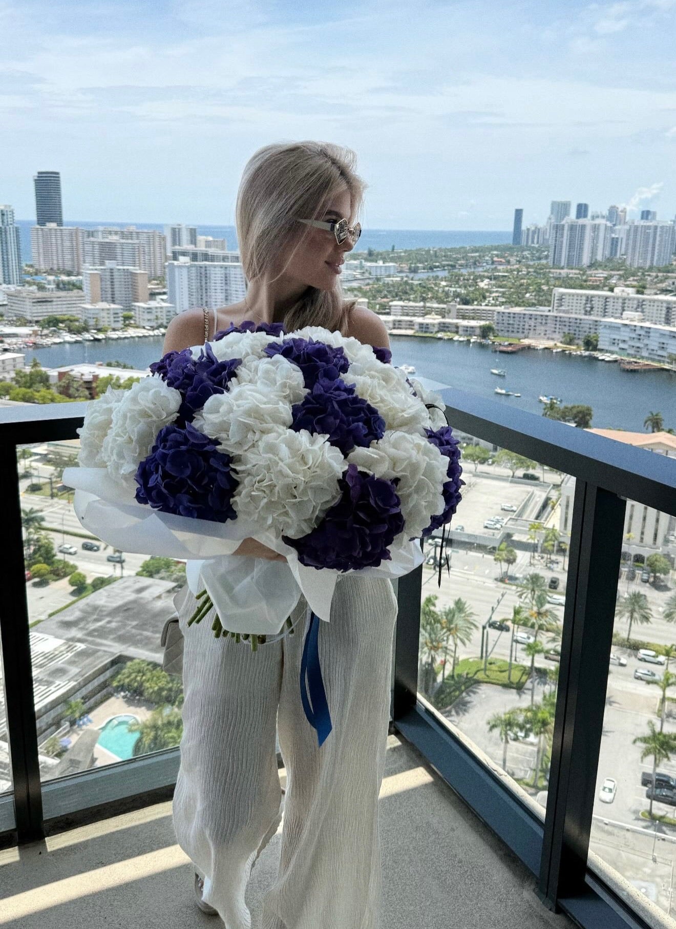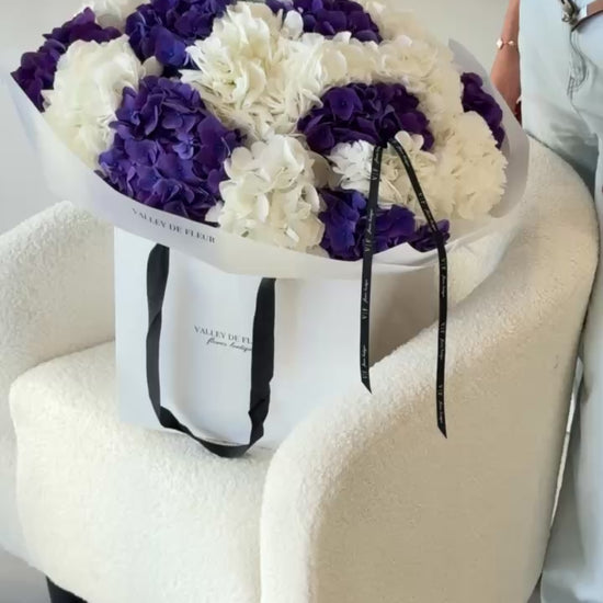 Dark Lavender and White Hydrangea Arrangement This sophisticated floral composition pairs deep lavender hydrangeas with pristine white blooms, creating a striking contrast that commands attention. The dark lavender provides rich, moody depth while the white hydrangeas brighten and balance the arrangement, resulting in an elegant display suitable for weddings, events, or refined home décor. Hydrangeas are prized for their voluminous blooms and exceptional longevity in arrangements, offering weeks of visual impact. This color combination evokes both modern minimalism and timeless romance, making it versatile for various aesthetic preferences and occasions.