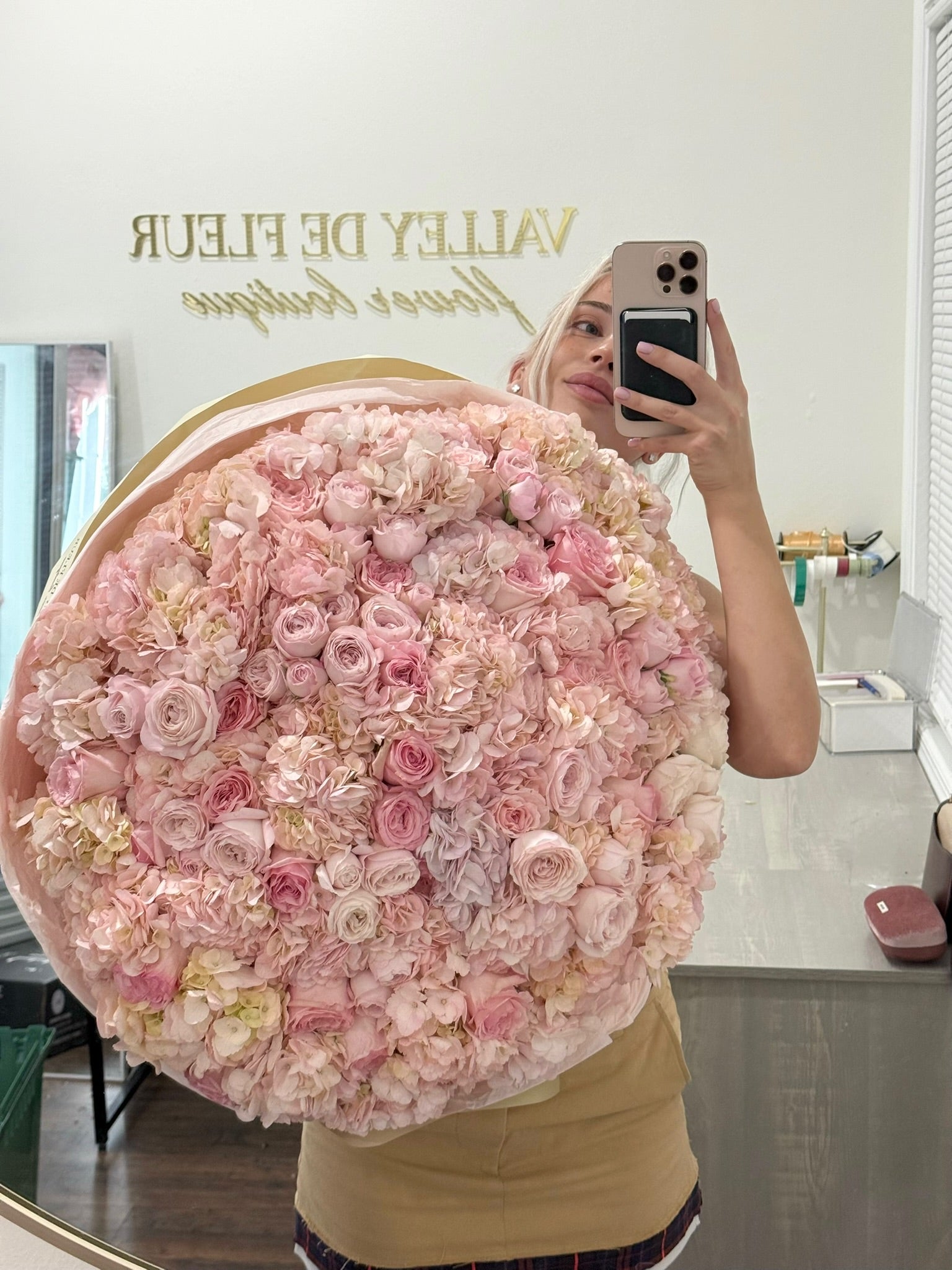 Elevate any occasion with this sophisticated large bouquet, featuring premium light pink hydrangeas paired with delicate light pink garden roses. The hydrangeas provide lush, voluminous texture while the garden roses add refined elegance and subtle fragrance. This carefully curated combination creates a romantic, timeless arrangement perfect for celebrations, expressions of gratitude, or simply brightening a space. Each stem is selected for quality and longevity, ensuring your bouquet maintains its beauty throughout the week.