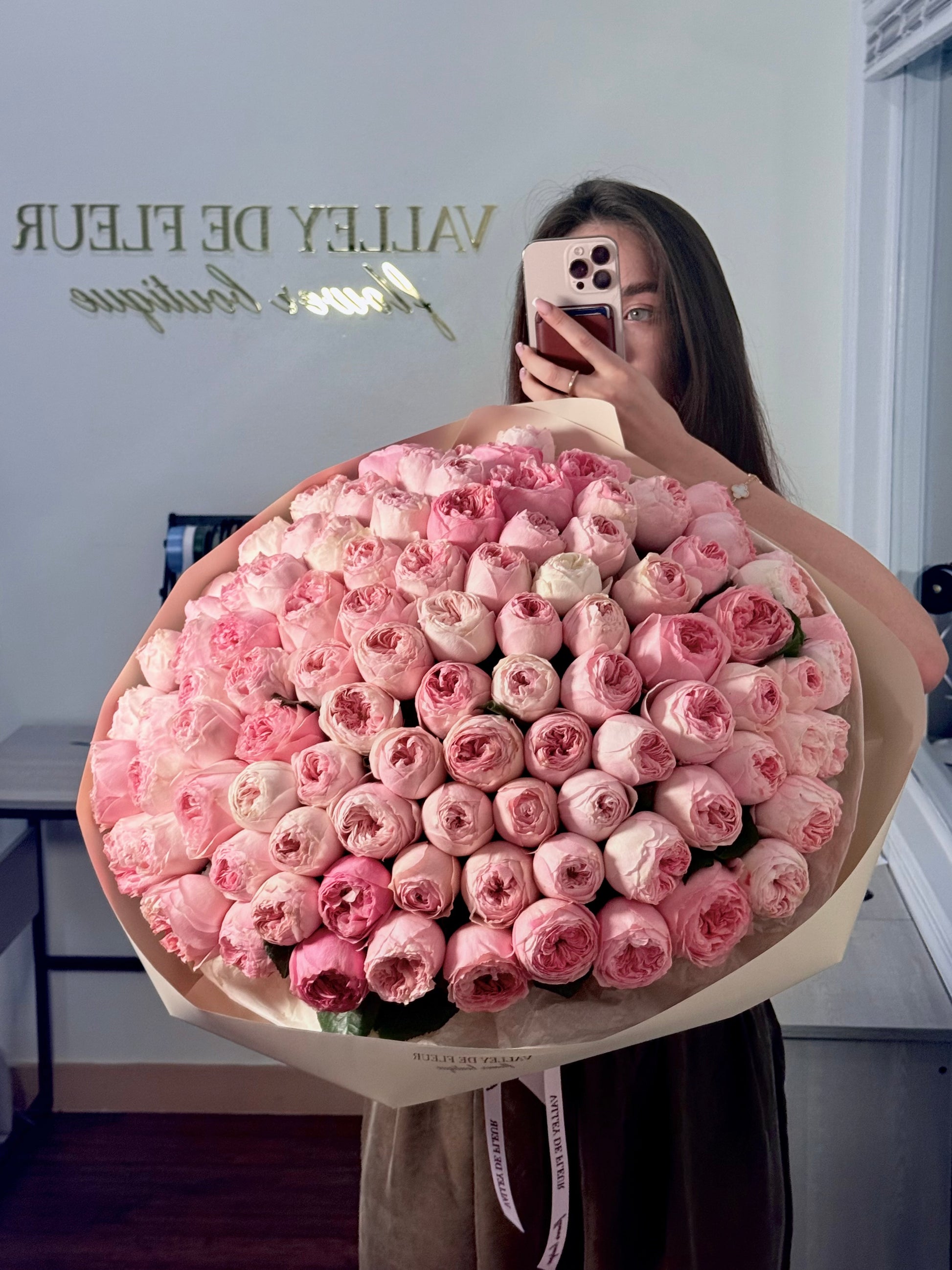 Захватывающая дух композиция из 100 отборных садовых роз нежных романтических розовых оттенков. Пышный, объемный и красиво упакованный — этот букет создан, чтобы произвести впечатление.